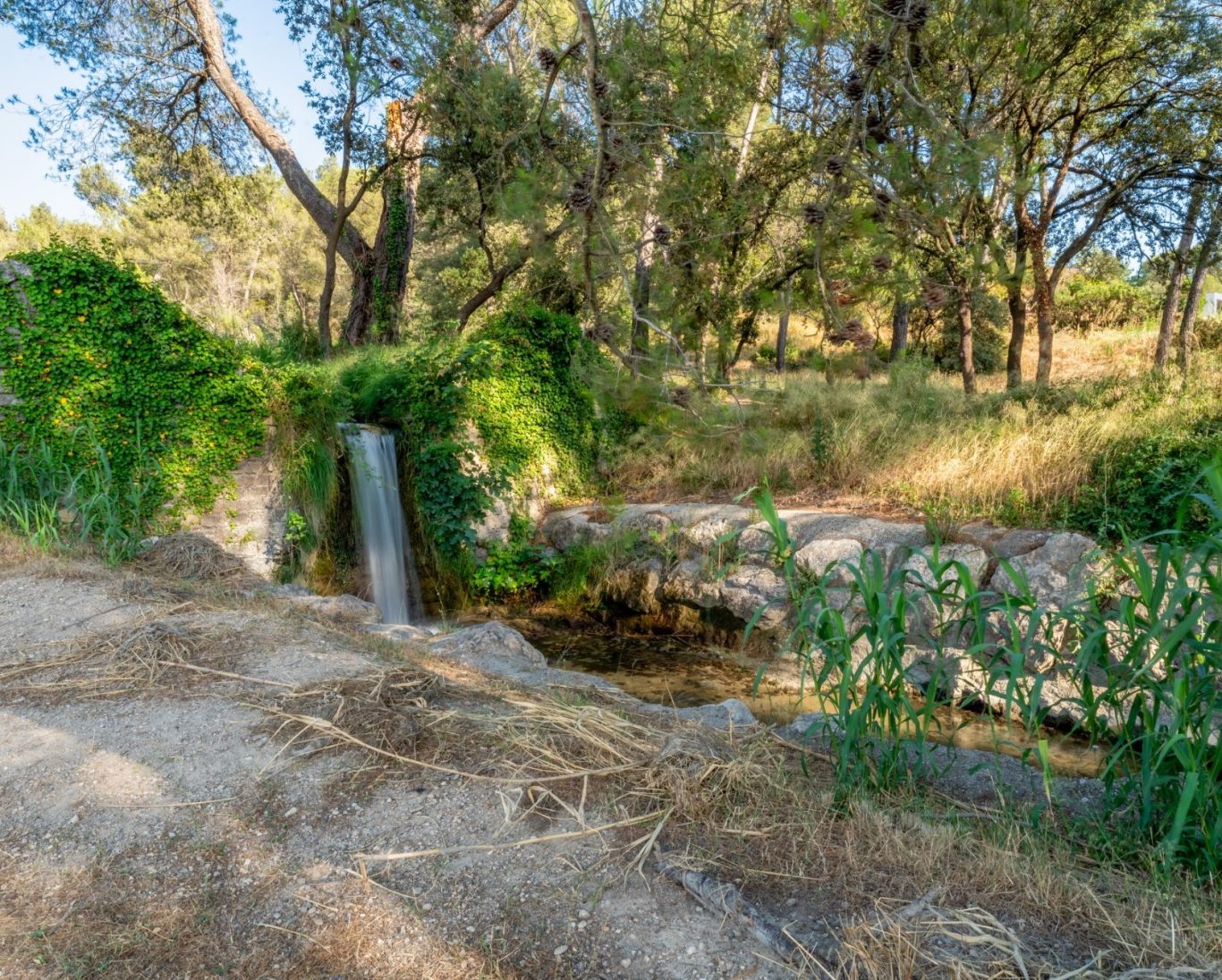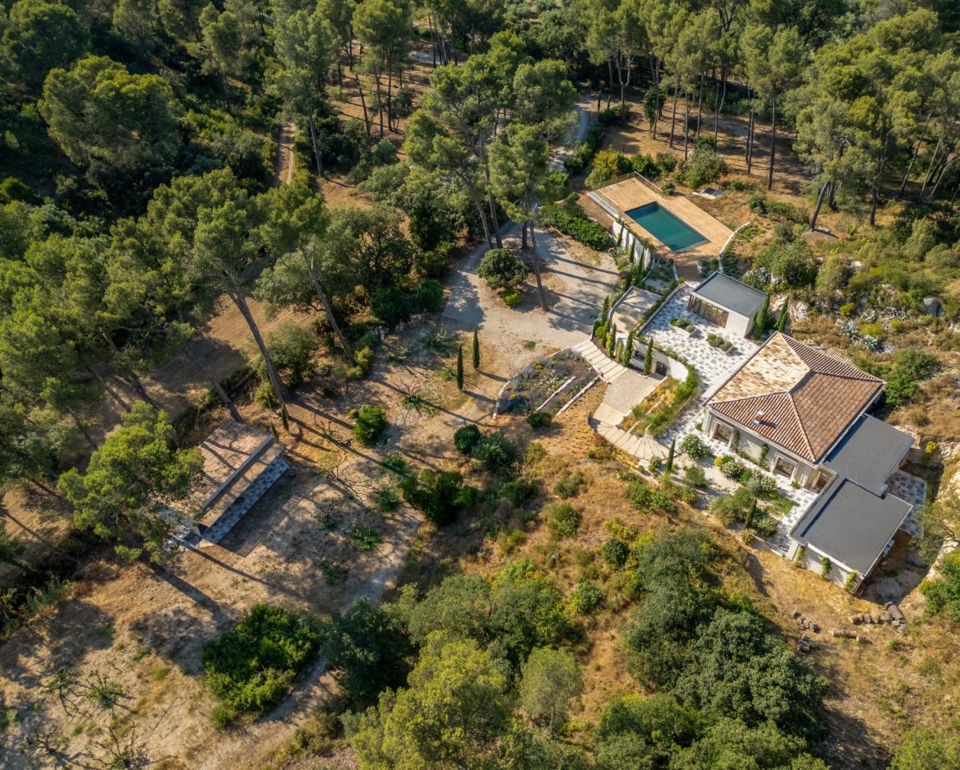 Entre oliviers, végétation méditerranéenne et cascades, les espaces extérieurs offrent une lecture naturelle et structurée du paysage, dans un équilibre sobre et maîtrisé.