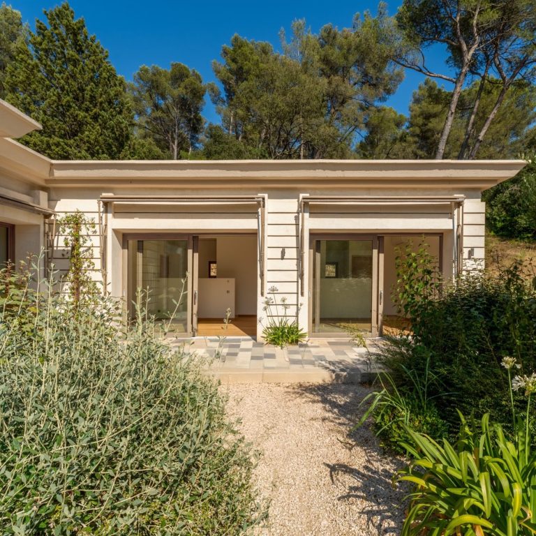 Les aménagements extérieurs ont été repensés avec des pierres provenant des Les Baux-de-Provence, apportant une matière authentique et une parfaite intégration au site.